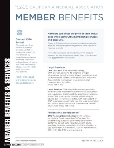 Legal Services CMA On-Call: CMA’s health law library, CMA On-Call, contains 46 chapters of legal information, including current laws, regulations, and court decisions related to the practice of medicine. Accessible to members at www.cmanet.org/ cma-on-call or by calling (800) 786-4262. Legal Services: CMA’s legal department provides members with information and resources about laws and regulations that impact the practice of medicine. While CMA staff cannot provide individual legal advice, our research associates, with the support of CMA legal counsel, will help you find legal information and resources on a multitude of health-law related issues. Call (800) 786-4262.
