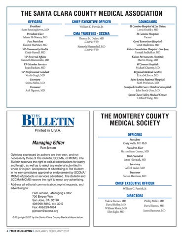 Opinions expressed by authors are their own, and not necessarily those of The Bulletin, SCCMA, or MCMS. The Bulletin reserves the right to edit all contributions for clarity and length, as well as to reject any material submitted in whole or in part. Acceptance of advertising in The Bulletin in no way constitutes approval or endorsement by SCCMA/ MCMS of products or services advertised. The Bulletin and SCCMA/MCMS reserve the right to reject any advertising. Address all editorial communication, reprint requests, and advertising to: Pam Jensen, Managing Editor 700 Empey Way San Jose, CA 95128 408/998-8850, ext. 3012 Fax: 408/289-1064 pjensen@sccma.org © Copyright 2017 by the Santa Clara County Medical Association.