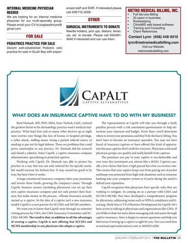 WHAT DOES AN INSURANCE CAPTIVE HAVE TO DO WITH MY BUSINESS? Basil Hantash, MD, PhD, MBA, from Turlock, Calif., realized the greatest threat to his dermatology practice wasn’t medical malpractice. What kept him and so many other doctors up at night were worries over things like loss of license or hospital privilege, a cyber attack, staffing issues, losing a patient referral source or needing to pay out for legal defense. These are problems that could prove catastrophic to any practice. Dr. Hantash did his research and found a solution. Enter CapAlt, a captive insurance company administrator, specializing in protected captives. Working with CapAlt, Dr. Hantash was able to protect his practice in a way that was not only tailored for his specific needs, but would increase his bottom line. It may sound too good to be true, but here’s how it works. A large commercial insurance company takes your premiums and invests those funds, growing the company’s assets. Through CapAlt, business owners (including physicians) can set up their own captive insurance company and not only protect their business, but make money in the process. Allstate Insurance actually started as a captive. So the idea of a captive isn’t a new insurance model; CapAlt is a new partner for SCCMA and MCMS members. We want you to know that CapAlt went through an extensive vetting process by CMA, the CMA Insurance Committee and SCCMA-MCMS. The result is that, in addition to all the advantages of owning a captive, CapAlt is now offering free SCCMA and MCMS membership to any physician who adopts a captive.