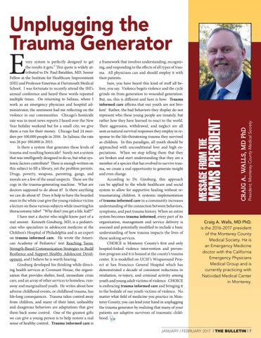 a framework that involves understanding, recognizing, and responding to the effects of all types of trauma. All physicians can and should employ it with their patients. Sure, you have heard this kind of stuff all before, you say. Violence begets violence and the cycle grinds on from generation to wounded generation. But, no, this is different and here is how: Trauma informed care affirms that our youth are not broken! Rather, the bad behaviors they display do not represent who these young people are innately, but rather how they have learned to react to the world. Their aggression, withdrawal, and neglect are all seen as natural survival responses they employ in response to the life-threatening trauma they survived as children. In this paradigm, all youth should be approached with unconditional love and high expectations. When we stop telling them that they are broken and start understanding that they are a member of a species that has evolved to survive trauma, we create a real opportunity to generate insight and even change. According to Dr. Ginsburg, this approach can be applied to the whole healthcare and social system to allow for supportive healing without retraumatizing children. A systemic implementation of trauma informed care in a community increases understanding of the connection between behaviors, symptoms, and past trauma history. When an entire system becomes trauma informed, every part of its organization, management and service delivery is assessed and potentially modified to include a basic understanding of how trauma impacts the lives of those seeking services. CHOICE is Monterey County’s first and only hospital-linked violence intervention and prevention program and it is housed at the county’s trauma center. It is modelled on UCSF’s Wraparound Project at San Francisco General Hospital which has demonstrated a decade of consistent reductions in retaliation, re-injury, and criminal activity among youth and young adult victims of violence. CHOICE is embracing trauma informed care and bringing it to the bedside of our youth victims of violence. No matter what field of medicine you practice in Monterey County, you can lend your hand in unplugging the trauma generator by realizing that many of your patients are adaptive survivors of traumatic childhood.