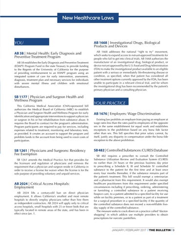 AB 2024 | Critical Access Hospitals: Employment AB 2024 lifts a century-old ban on direct physician employment. It allows California’s smallest and most remote hospitals to directly employ physicians rather than hire them as independent contractors. AB 2024 will apply only to critical access hospitals, small hospitals with 25 or fewer beds that are typically located in remote areas of the state, and has been in effect since Jan. 1.