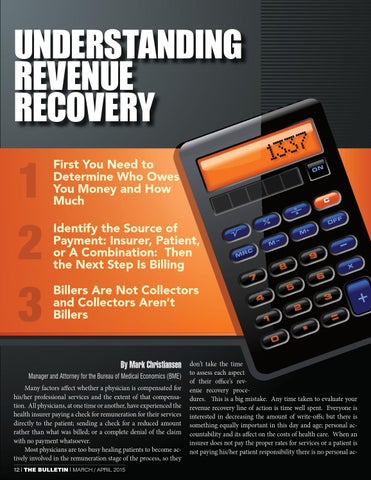 By Mark Christiansen Manager and Attorney for the Bureau of Medical Economics (BME) Many factors affect whether a physician is compensated for his/her professional services and the extent of that compensation. All physicians, at one time or another, have experienced the health insurer paying a check for remuneration for their services directly to the patient; sending a check for a reduced amount rather than what was billed; or a complete denial of the claim with no payment whatsoever. Most physicians are too busy healing patients to become actively involved in the remuneration stage of the process, so they 12 | THE BULLETIN | MARCH / APRIL 2015