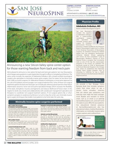 Home Remedy Book We provide a free 36-page Home Remedy Book that includes symptom charts that show when to see a doctor; home remedies; stretches that can relieve pain symptoms; and exercises that make the back stronger, more flexible and resistant to future strain. Call us, or email us at admin@ SanJoseNeurospine.com, and we’ll send 10 copies to your office for your patients. Our educational Internet presence at SanJoseNeurospine.com also has educational videos, medical illustrations, information on minimally invasive spine surgery options and a referral form.