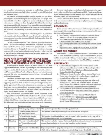 1. Care coordination for persons with complex mental health, substance use, and medical conditions: The case for providers. Available 3/10/15 online: http://www.ibhp.org/uploads/file/ BusinessCaseProvidersFinal.pdf 2. CDC Report: Mental Illness Surveillance Among Adults in the United States. Available 3/10/15 online: http://www.cdc.gov/ mentalhealthsurveillance/fact_sheet.html 3. California Primary Care Association, Integrated Behavioral Health Care: An Effective and Affordable Model. Available 3/10/15 online: http://www.cpca.org/cpca/assets/file/policy-andadvocacy/active-policy-issues/mhsa/integrationbrief.pdf 4. Effects of BATHE Interview Protocol on Patient Satisfaction. Available 3/10/15 online: http://www.ncbi.nlm.nih.gov/pmc/ articles/PMC3526719/ 5. National Alliance on Mental Illness (NAMI) Fact Sheet. Available 3/10/15 online: http://www2.nami.org/Content/ NavigationMenu/Inform_Yourself/About_Mental_Illness/ About_Mental_Illness.htm