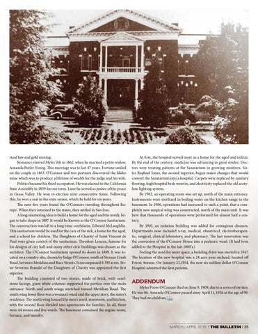ticed law and gold mining. Romance entered Myles’ life in 1862, when he married a petite widow, Amanda Butler Young. This marriage was to last 47 years. Fortune smiled on the couple in 1863. O’Connor and two partners discovered the Idaho mine which was to produce a lifetime of wealth for the judge and his wife. Politics became his third occupation. He was elected to the California State Assembly in 1859 for one term. Later he served as justice of the peace in Grass Valley. He won re-election nine consecutive times. Following this, he won a seat in the state senate, which he held for six years. The next five years found the O’Connors traveling throughout Europe. When they returned to the states, they settled in San Jose. A long simmering idea to build a home for the aged and the needy, began to take shape in 1887. It would be known as the O’Connor Sanitarium. The construction was left to a long-time confidante, Edward McLaughlin. This sanitarium would be used for the care of the sick, a home for the aged, and a school for children. The Daughters of Charity of Saint Vincent de Paul were given control of the sanitarium. Theodore Lenzen, famous for his designs of city hall and many other civic buildings was chosen as the architect. The O’Connor Sanitarium opened its doors in 1889. It was located on a country site, chosen by Judge O’Connor, south of Stevens Creek Road, between Meridian and Race Streets. It encompassed 8.395 acres. Sister Severina Brandel of the Daughters of Charity was appointed the first superior. The building consisted of two stories, made of brick, with sandstone facings, giant white columns supported the portico over the main entrance. North and south wings stretched toward Meridian Road. The south wing lower floor was a woman’s ward and the upper story, the sister’s residence. The north wing housed the men’s ward, storeroom, and kitchen, with the second floor divided into apartments for families. In all, there were 44 rooms and five wards. The basement contained the engine room, furnace, and laundry.