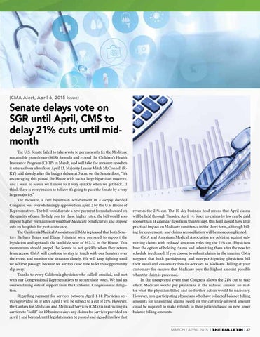 Senate delays vote on SGR until April, CMS to delay 21% cuts until midmonth The U.S. Senate failed to take a vote to permanently fix the Medicare sustainable growth rate (SGR) formula and extend the Children’s Health Insurance Program (CHIP) in March, and will take the measure up when it returns from a break on April 13. Majority Leader Mitch McConnell (RKY) said shortly after the budget debate at 3 a.m. on the Senate floor, “It’s encouraging this passed the House with such a large bipartisan majority, and I want to assure we’ll move to it very quickly when we get back…I think there is every reason to believe it’s going to pass the Senate by a very large majority.” The measure, a rare bipartisan achievement in a deeply divided Congress, was overwhelmingly approved on April 2 by the U.S. House of Representatives. The bill would create a new payment formula focused on the quality of care. To help pay for these higher rates, the bill would also impose higher premiums on wealthier Medicare beneficiaries and impose cuts on hospitals for post-acute care. The California Medical Association (CMA) is pleased that both Senators Barbara Boxer and Diane Feinstein were prepared to support the legislation and applauds the landslide vote of 392-37 in the House. This momentum should propel the Senate to act quickly when they return from recess. CMA will continue to stay in touch with our Senators over the recess and monitor the situation closely. We will keep fighting until we achieve passage, because we are too close now to let this opportunity slip away. Thanks to every California physician who called, emailed, and met with our Congressional Representatives to secure their votes. We had an overwhelming vote of support from the California Congressional delegation. Regarding payment for services between April 1-14: Physician services provided on or after April 1 will be subject to a cut of 21%. However, the Centers for Medicare and Medicaid Services (CMS) is instructing its carriers to “hold” for 10 business days any claims for services provided on April 1 and beyond, until legislation can be passed and signed into law that