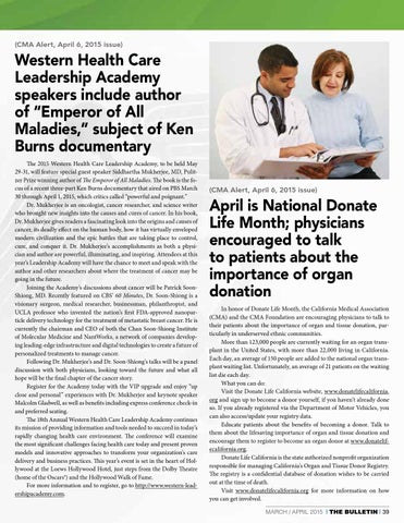April is National Donate Life Month; physicians encouraged to talk to patients about the importance of organ donation In honor of Donate Life Month, the California Medical Association (CMA) and the CMA Foundation are encouraging physicians to talk to their patients about the importance of organ and tissue donation, particularly in underserved ethnic communities. More than 123,000 people are currently waiting for an organ transplant in the United States, with more than 22,000 living in California. Each day, an average of 150 people are added to the national organ transplant waiting list. Unfortunately, an average of 21 patients on the waiting list die each day. What you can do: Visit the Donate Life California website, www.donatelifecalifornia. org and sign up to become a donor yourself, if you haven’t already done so. If you already registered via the Department of Motor Vehicles, you can also access/update your registry data. Educate patients about the benefits of becoming a donor. Talk to them about the lifesaving importance of organ and tissue donation and encourage them to register to become an organ donor at www.donatelifecalifornia.org. Donate Life California is the state authorized nonprofit organization responsible for managing California’s Organ and Tissue Donor Registry. The registry is a confidential database of donation wishes to be carried out at the time of death. Visit www.donatelifecalifornia.org for more information on how you can get involved. MARCH / APRIL 2015 | THE BULLETIN | 39