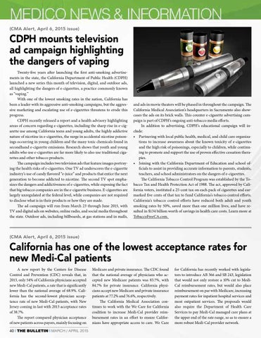 California has one of the lowest acceptance rates for new Medi-Cal patients A new report by the Centers for Disease Control and Prevention (CDC) reveals that, in 2013, only 54% of California physicians accepted new Medi-Cal patients, a rate that is significantly lower than the national average of 68.9%. California has the second-lowest physician acceptance rate of new Medi-Cal patients, with New Jersey coming in last with 2013 acceptance rates of 38.7%. The report compared physician acceptance of new patients across payors, mainly focusing on 40 | THE BULLETIN | MARCH / APRIL 2015