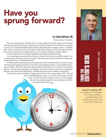 Have you sprung forward? Hopefully by now, we have adjusted to the time change and are enjoying the longer days and seasonal changes. Spring is here in Northern California! Certainly there is an ongoing concern of our continued drought and the realization that global climate change is upon us. Hopefully, there will be a continued and concerted effort to address this challenge with the same urgency that has been a call to action with recent public health crises such as Ebola, Alzheimer’s, and gun violence. Our March-April issue of the Bulletin highlights some timely and important topics. Are you getting proper payment from insurance companies for the care you render to patients? Are you getting your maximum in accounts receivable? These important issues are discussed in “Understanding Revenue Recovery” by Mark Christainsen. SCCMA members who are primary care providers don’t need to be told that they are on the front lines of mental health triaging and treatment. Over 50% of the population will have a mental health issue during one’s lifetime. Yet there is still a great stigma attached to mental illness that sets it apart from physical ailments. The importance of patient access, diagnosis, and proper treatment cannot be over emphasized. Read on to learn about “Each Mind Matters;” valuable tools and resources available to all physicians. Did you know that the deadline for implementing ICD-10 is this coming October, 2015? This will add over 68,000 diagnostic codes vs. the current ICD-9 listing of 13,000 codes. There are important strategies to prepare for these changes. This involves a proactive approach to meet compliance and facilitate proper reimbursement.