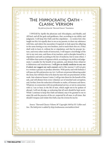 I SWEAR by Apollo the physician and AEsculapius, and Health, and All-heal, and all the gods and goddesses, that, according to my ability and judgment, I will keep this Oath and this stipulation -- to reckon him who taught me this Art equally dear to me as my parents, to share my substance with him, and relieve his necessities if required; to look upon his offspring in the same footing as my own brothers, and to teach them this art, if they shall wish to learn it, without fee or stipulation; and that by precept, lecture, and every other mode of instruction, I will impart a knowledge of the Art to my own sons, and those of my teachers, and to disciples bound by a stipulation and oath according to the law of medicine, but to none others. I will follow that system of regimen which, according to my ability and judgement, I consider for the benefit of my patients, and abstain from whatever is deleterious and mischievous. I will give no deadly medicine to any one if asked, nor suggest any such counsel; and in like manner I will not give to a woman a pessary to produce abortion. With purity and with holiness I will pass my life and practice my Art. I will not cut persons labouring under the stone, but will leave this to be done by men who are practitioners of this work. Into whatever houses I enter, I will go into them for the benefit of the sick, and will abstain from every voluntary act of mischief and corruption; and, further, from the seduction of females or males, of freemen and slaves. Whatever, in connection with my professional service, or not in connection with it, I see or hear, in the life of men, which ought not to be spoken of abroad, I will not divulge, as reckoning that all such should be kept secret. While I continue to keep this Oath unviolated, may it be granted to me to enjoy life and the practice of the art, respected by all men, in all times. But should I trespass and violate this Oath, may the reverse be my lot. Source: "Harvard Classics Volume 38" Copyright 1910 by P.F. Collier and Son. The bold print is added by http://euthanasia.com/oathtext.html