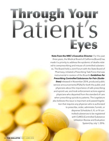 Note from the MBC’s Executive Director: For the past three years, the Medical Board of California (Board) has made it a priority to address the epidemic of deaths related to overprescribing and misuse of controlled substances. The Board held a Joint Forum with the State Board of Pharmacy, initiated a Prescribing Task Force that was instrumental in revision of the Board’s Guidelines for Prescribing Controlled Substances for Pain (Guidelines) released in November 2014, produced public service announcements (PSAs) for both the public and physicians about the importance of safe prescribing and opioid use, and took enforcement actions against physicians who departed from the standard of care when prescribing opioids to patients. The Legislature also believes this issue is important and passed legislation that requires any physician who is authorized to prescribe, order, administer, furnish, or dispense Schedules II, III, or IV controlled substances to be registered with CURES (Controlled Substance Utilization Review and Evaluation System) by July 1, 2016.