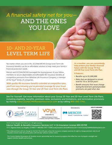 AND THE ONES YOU LOVE 10- AND 20-YEAR LEVEL TERM LIFE No matter where you are in life, SCCMA/MCMS Group Level Term Life Insurance benefits can be an affordable solution to help meet your family’s financial protection needs. Mercer and SCCMA/MCMS leveraged the buying power of your fellow members to secure dependable and affordable life insurance benefits at competitive premiums from ReliaStar Life Insurance Company, a member of the Voya® family of companies.