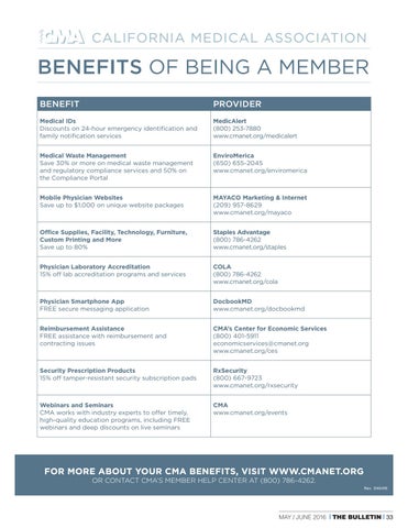 FOR MORE ABOUT YOUR CMA BENEFITS, VISIT WWW.CMANET.ORG OR CONTACT CMA’S MEMBER HELP CENTER AT (800) 786-4262.