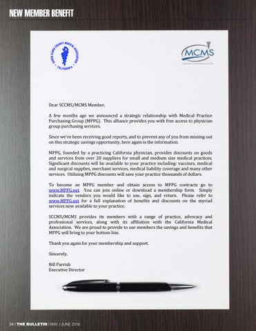 Dear SCCMS/MCMS Member, A few months ago we announced a strategic relationship with Medical Practice Purchasing Group (MPPG). This alliance provides you with free access to physician group purchasing services. Since we’ve been receiving good reports, and to prevent any of you from missing out on this strategic savings opportunity, here again is the information. MPPG, founded by a practicing California physician, provides discounts on goods and services from over 20 suppliers for small and medium size medical practices. Significant discounts will be available to your practice including: vaccines, medical and surgical supplies, merchant services, medical liability coverage and many other services. Utilizing MPPG discounts will save your practice thousands of dollars. To become an MPPG member and obtain access to MPPG contracts go to www.MPPG.net. You can join online or download a membership form. Simply indicate the vendors you would like to use, sign, and return. Please refer to www.MPPG.net for a full explanation of benefits and discounts on the myriad services now available to your practice. SCCMS/MCMS provides its members with a range of practice, advocacy and professional services, along with its affiliation with the California Medical Association. We are proud to provide to our members the savings and benefits that MPPG will bring to your bottom line. Thank you again for your membership and support. Sincerely, Bill Parrish Executive Director