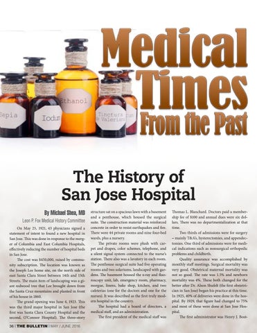 The History of San Jose Hospital By Michael Shea, MD Leon P. Fox Medical History Committee On May 25, 1921, 43 physicians signed a statement of intent to found a new hospital in San Jose. This was done in response to the merger of Columbia and East Columbia Hospitals, effectively reducing the number of hospital beds in San Jose. The cost was $450,000, raised by community subscription. The location was known as the Joseph Lee home site, on the north side of east Santa Clara Street between 14th and 15th Streets. The main item of landscaping was a giant redwood tree that Lee brought down from the Santa Cruz mountains and planted in front of his house in 1860. The grand opening was June 4, 1923. This was the third major hospital in San Jose (the first was Santa Clara County Hospital and the second, O’Connor Hospital). The three-story 36 | THE BULLETIN | MAY / JUNE 2016