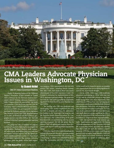 CMA Leaders Advocate Physician Issues in Washington, DC By Elizabeth McNeil CMA VP, Federal Government Relations Nearly 30 physician leaders of the California Medical Association (CMA) traveled to Capitol Hill in February for the American Medical Association (AMA) National Advocacy Conference to lobby Congress about the associations’ top health care priorities. CMA physicians also met with the leadership of the Centers for Medicare and Medicaid Services (CMS), who are responsible for implementing the Medicare payment reform legislation (the Medicare Access and CHIP Reauthorization Act of 2015, or MACRA) and the California geographic practice cost index (GPCI) “fix” that will overhaul California’s outdated geographic payment localities. The group met with 25 members of Congress and 40 staff members, lobbying for meaningful use simplification, Medicare recovery audit contractor audit reform, prescription drug cost reduction for patients, rational ways to curb the opioid epidemic, and the need to reverse the U.S. Department of Education’s regulation that excludes California physicians from the public service loan forgive38 | THE BULLETIN | MAY / JUNE 2016