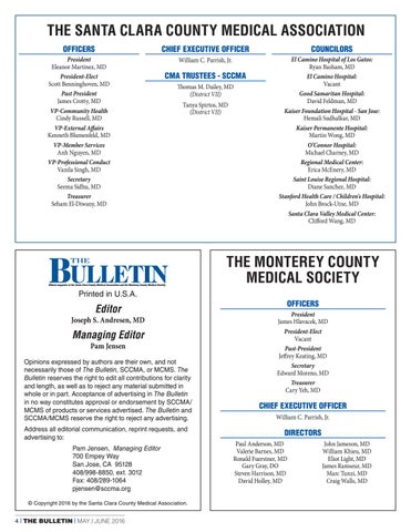 Opinions expressed by authors are their own, and not necessarily those of The Bulletin, SCCMA, or MCMS. The Bulletin reserves the right to edit all contributions for clarity and length, as well as to reject any material submitted in whole or in part. Acceptance of advertising in The Bulletin in no way constitutes approval or endorsement by SCCMA/ MCMS of products or services advertised. The Bulletin and SCCMA/MCMS reserve the right to reject any advertising. Address all editorial communication, reprint requests, and advertising to: Pam Jensen, Managing Editor 700 Empey Way San Jose, CA 95128 408/998-8850, ext. 3012 Fax: 408/289-1064 pjensen@sccma.org © Copyright 2016 by the Santa Clara County Medical Association.