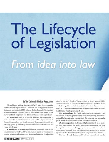 action by the CMA Board of Trustees. Many of CMA’s sponsored bills have their genesis in an idea submitted by our physician members. While not all CMA policies result in direct legislative action, they are used to guide CMA’s positions on the hundreds of health care bills that are introduced into the State Legislature each year. Bills are introduced: The California Legislature operates on a two‐ year session. Each year, primarily in January and February, bills are introduced by lawmakers for consideration. The governor may also call a special session of the Legislature to deal with specific subjects. CMA takes a position: Each year, with physician input, CMA monitors more than 500 bills and takes a public position on around 200 bills. Those positions include watch, support, oppose, support if amended and oppose unless amended. CMA also may choose to sponsor or co-sponsor legislation that is of critical importance to the physicians of California. Bills move through the process: If a bill is to become law, it must be