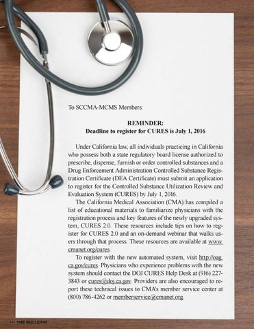 To SCCMA-MCMS Members: REMINDER: Deadline to register for CURES is July 1, 2016 Under California law, all individuals practicing in California who possess both a state regulatory board license authorized to prescribe, dispense, furnish or order controlled substances and a Drug Enforcement Administration Controlled Substance Registration Certificate (DEA Certificate) must submit an application to register for the Controlled Substance Utilization Review and Evaluation System (CURES) by July 1, 2016. The California Medical Association (CMA) has compiled a list of educational materials to familiarize physicians with the registration process and key features of the newly upgraded system, CURES 2.0. These resources include tips on how to register for CURES 2.0 and an on-demand webinar that walks users through that process. These resources are available at www. cmanet.org/cures. To register with the new automated system, visit http://oag. ca.gov/cures. Physicians who experience problems with the new system should contact the DOJ CURES Help Desk at (916) 2273843 or cures@doj.ca.gov. Providers are also encouraged to report these technical issues to CMA's member service center at (800) 786-4262 or memberservice@cmanet.org.