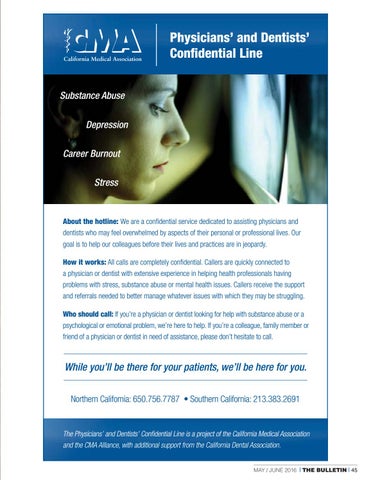 The Physicians’ and Dentists’ Confidential Line is a project of the California Medical Association and the CMA Alliance, with additional support from the California Dental Association. MAY / JUNE 2016 | THE BULLETIN | 45