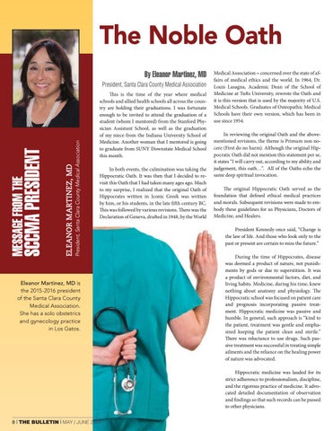 President, Santa Clara County Medical Association This is the time of the year where medical schools and allied health schools all across the country are holding their graduations. I was fortunate enough to be invited to attend the graduation of a student (whom I mentored) from the Stanford Physician Assistant School, as well as the graduation of my niece from the Indiana University School of Medicine. Another woman that I mentored is going to graduate from SUNY Downstate Medical School this month. In both events, the culmination was taking the Hippocratic Oath. It was then that I decided to revisit this Oath that I had taken many ages ago. Much to my surprise, I realized that the original Oath of Hippocrates written in Iconic Greek was written by him, or his students, in the late fifth century BC. This was followed by various revisions. There was the Declaration of Geneva, drafted in 1948, by the World