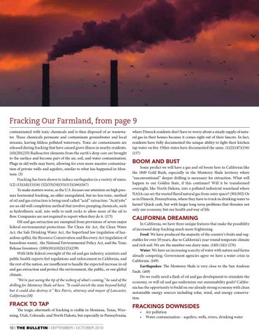 The tragic aftermath of fracking is visible in Montana, Texas, Wyoming, Utah, Colorado, and North Dakota, but especially in Pennsylvania, 10 | THE BULLETIN | SEPTEMBER / OCTOBER 2013