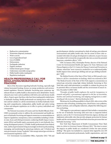 gas development, whether conventional or shale oil and gas, pose inherent environmental and public health risks, but the extent of these risks associated with shale oil and gas development is unknown, in part, because the studies GAO reviewed do not generally take into account the potential long-term, cumulative effects.” (215) CDC: In January 2012, Christopher Portier, director of the National Center for Environmental Health and Agency for Toxic Substances and Disease Registry at the U.S. Centers for Disease Control and Prevention in Atlanta, stated that “more research is needed for us to understand public health impacts from natural gas drilling and new gas drilling technologies.” (202) The Medical Society of the State of New York, in 2010, passed a resolution to call for a moratorium on fracking, which was renewed in 2013. “The Medical Society of the State of New York supports a moratorium on natural gas extraction using high volume hydraulic fracturing in New York State until valid information is available to evaluate the process for its potential effects on human health and the environment (Council Action, December 9, 2010).”(185) “Principles of public health emphasize the need for transparency in research and policy, a precautionary approach in the face of uncertainty, baseline and continued monitoring, and adapting management as understanding of risks increases.” Katrina Korfmacher (213) Physicians for Social Responsibility in March 2012, after review of the numerous risks of fracking, including noise, diesel fumes, toxic pollution, fugitive methane, and earthquake induction, adopted the following position on fracking. “PSR supports a precautionary approach that includes a moratorium on the use of hydraulic fracturing until such time as impartial federal agencies, such as the U.S. Environmental Protection Agency, develop and implement enforceable rules that provide adequate protection for human health and the environment from fossil fuel extraction processes that use hydraulic fracturing. “ (175) New York State Department of Health Commissioner Nirav Shah states in a letter to Governor Cuomo, February 2013, “The time to ensure the impacts on public health are considered is before the state permits drilling.” This quote was included in a separate letter signed by over 250 health and environmental professionals, health organizations, and over