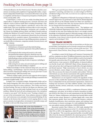Fracking Our Farmland, from page 11 150 elected officials to the New York Governor. The letter asked for a moratorium on fracking until completion of ongoing health studies, comprehensive independent Health Impact Assessment (HIA) that is site specific is completed, and that there is transparent participation of health professionals and the public. (201) Cornell Report, a review of 24 case studies describing human and animal effects of adjacent fracking processes. Livestock and house pets suffered a variety of adverse health effects including dermatologic, respiratory, neurological, urinary, digestive, reproductive, and in some cases sudden death. There were similarities in human effects on the same properties studied. Dr. Michelle Bamberger, veterinarian and a member of the Ulysses Gas Drilling Advisory Board, and Robert Oswald, professor of Molecular Medicine at Cornell University, wrote, “Animals, especially livestock, are sensitive to the contaminants released into the environment by drilling and by its cumulative impacts. Documentation of cases in six states strongly implicates exposure to gas drilling operations causing serious health effects on humans, companion animals, livestock, horses, and wildlife.” (10)(216) The researchers recommend: • Full disclosure of chemicals used when hydrofracking • Prohibiting non-disclosure agreements when public health is at stake • Increasing food safety testing and research, as the study documented that animals exposed to chemicals were not tested prior to slaughter, and little is known about the effects of hydrofracking on meat and dairy products • Improving the monitoring of routes of exposure, including in water, soil, and air • Fully testing the air, water, soil, and animals prior to drilling and at regular intervals after drilling is completed “Without knowledge of all the chemicals being used, you can’t test before drilling,” said Bamberger. “And if we don’t have pre-drilling tests, then if you find a chemical post-drilling, how can you prove that “it came from hydrofracking?” (289) They further state, “Without complete studies, given the many apparent adverse impacts on human and animal health, a ban on shale gas drilling is essential for the protection of public health.” (216) Ecologist View: Acclaimed ecologist, distinguished scholar and author, Sandra Steingraber, PhD, who is often cited as a modern Rachel Carson, stated more directly in a press conference, “New Yorkers now know a lot about fracking. The more we find out, the deeper our objections. And that’s because, when you look under fracking’s hood, you see terrifying problems. Behind the hard sell and soothing promises, this contraption is unsafe at any speed.” (217) She later wrote, “Fracking is linked to every part of the environmental crisis—from radiation exposure to habitat loss—and contravenes every principle of environmental thinking. It’s the tornado on the horizon that is poised to wreck ongoing efforts to create green economies, local agriculture, investments in renewable energy, and the ability to ride your bike along country roads.”(218) Cindy Russell, MD, is the Vice-President of Community Health, Chair of the Environmental Health Committee, and a CMA Delegate with the Santa Clara County Medical Association. She is board certified in plastic surgery and is currently practicing with the Palo Alto Medical Foundation Group. 12 | THE BULLETIN | SEPTEMBER / OCTOBER 2013