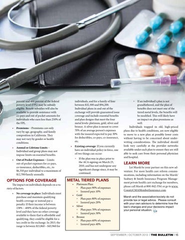 individuals, and for a family of four between $32,500 and $94,200. Individual plans in and out of the exchange will provide guaranteed issue coverage and include essential benefits and plan designs that meet the four metal levels: platinum, gold, silver and bronze. A silver plan is meant to cover 70% of an average person’s expenses with the insured expected to pay 30% for deductibles, co-pays, co-insurance, etc. • Existing coverage: If you currently have an individual policy in force, one of two things can occur: ȧȧ If the plan was in place prior to the ACA signing on March 23, 2010, and has not undergone any significant change since, it may be continued.