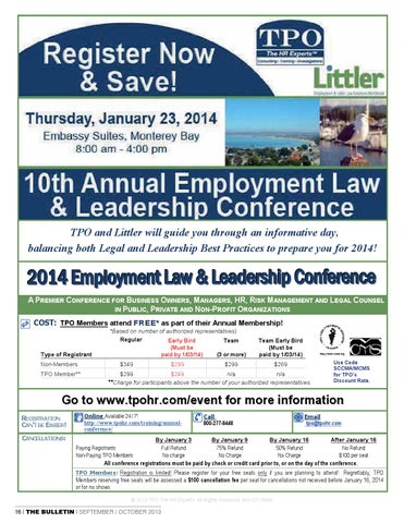 2014 Employment Law & Leadership Conference A PREMIER CONFERENCE FOR BUSINESS OWNERS, MANAGERS, HR, RISK MANAGEMENT AND LEGAL COUNSEL IN PUBLIC, PRIVATE AND NON-PROFIT ORGANIZATIONS COST: TPO Members attend FREE* as part of their Annual Membership!