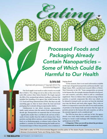 Brita Belli is editor of E/The Environmental Magazine and the author of The Autism Puzzle: Connecting the Dots Between Environmental Toxins and Rising Autism Rates. 18 | THE BULLETIN | SEPTEMBER / OCTOBER 2013