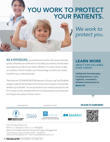 AS A PHYSICIAN, you probably know better than anyone else how quickly a disability can strike and not only delay your dreams, but also leave you unable to provide for your family. Whether it is a heart attack, stroke, car accident or fall off a ladder, any of these things can affect your ability to perform your medical specialty. That’s why the SCCMA/MCMS/CMA sponsors a Group Long-Term Disability program underwritten by New York Life Insurance Company, with monthly benefits up to $10,000. You are protected in your medical specialty for the first 10 years of your disability. With this critical protection, you’ll have one