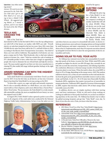 1. 2013 Motor Trend Car of the Year: Tesla Model S. http://www. motortrend.com/oftheyear/car/1301_2013_motor_trend_car_ of_the_year_tesla_model_s/viewall.html 2. Automobile of the Year. http://www.automobilemag.com/ features/awards/1301_2013_automobile_of_the_year_tesla_ model_s/viewall.html 3. A Decade Later, Tesla Now Officially a Threat to the Auto Industry. http://gigaom.com/2013/08/26/a-decade-later-teslanow-officially-a-threat-to-the-auto-industry/ 4. Electric Vehicles: Compare Side-by-Side. http://www. fueleconomy.gov/feg/evsbs.shtml 5. Do the Math. MPG Electric Cars. UCSD Physics. http://physics. ucsd.edu/do-the-math/tag/car/ SEPTEMBER / OCTOBER 2013 | THE BULLETIN | 33
