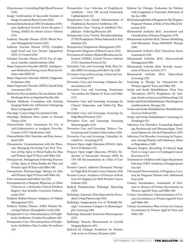 Referral for Otologic Evaluation for Patients with Congenital or Traumatic Deformity of the Ear (188) Rh Immunoglobulin (Rhogam) for Rh-Negative Pregnant Women at Risk of Fetal Blood Exposure (255) Rheumatoid Arthritis (RA): Assessment and Classification of Disease Prognosis (179) Rheumatoid Arthritis (RA): Disease Modifying Anti-Rheumatic Drug (DMARD) Therapy (108) Rheumatoid Arthritis (RA): Functional Status Assessment (178) Rheumatoid Arthritis (RA): Glucocorticoid Management (180) Rheumatoid Arthritis (RA): Periodic Assessment of Disease Activity (177) Rheumatoid Arthritis (RA): Tuberculosis Screening (176) Screening or Therapy for Osteoporosis for Women Aged 65 Years and Older (39) Stroke and Stroke Rehabilitation: Deep Vein Thrombosis (DVT) Prophylaxis for Ischemic Stroke or Intracranial Hemorrhage (31) Stroke and Stroke Rehabilitation: Discharged on Antithrombotic Therapy (32) Stroke and Stroke Rehabilitation: Rehabilitation Services Ordered (36) Stroke and Stroke Rehabilitation: Screening for Dysphagia (35) Substance Use Disorders: Counseling Regarding Psychosocial and Pharmacologic Treatment Options for Alcohol Dependence (247) Substance Use Disorders: Screening for Depression Among Patients with Substance Abuse or Dependence (248) Thoracic Surgery: Recording of Clinical Stage Prior to Lung Cancer or Esophageal Cancer Resection (157) Treatment for Children with Upper Respiratory Infection (URI): Avoidance of Inappropriate Use (65) Ultrasound Determination of Pregnancy Location for Pregnant Patients with Abdominal Pain (254) Urinary Incontinence: Assessment of Presence or Absence of Urinary Incontinence in Women Aged 65 Years and Older (48) Urinary Incontinence: Characterization of Urinary Incontinence in Women Aged 65 Years and Older (49) Urinary Incontinence: Plan of Care for Urinary Incontinence in Women Aged 65 Years and Older (50)