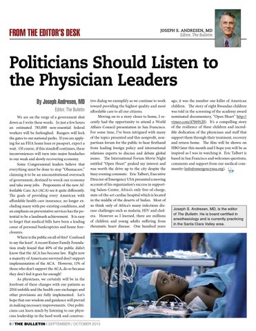 Politicians Should Listen to the Physician Leaders By Joseph Andresen, MD Editor, The Bulletin We are on the verge of a government shut down as I write these words. In just a few hours an estimated 785,000 non-essential federal workers will be furloughed. Rangers will lock the gates to our national parks. If you are applying for an FHA home loan or passport, expect a wait. Of course, if this standoff continues, these inconveniences will turn into major headaches to our weak and slowly recovering economy. Some Congressional leaders believe that everything must be done to stop “Obamacare,” claiming it to be an unconstitutional overreach of government, destined to wreck our economy and take away jobs. Proponents of the new Affordable Care Act (ACA) see it quite differently. The goals of providing every American with affordable health care insurance, no longer excluding many with pre-existing conditions, and an emphasis on preventative services has the potential to be a landmark achievement. It is easy to forget that medical bills have been a leading cause of personal bankruptcies and home foreclosures. Where is the public on all of this? Confused to say the least! A recent Kaiser Family Foundation study found that 40% of the public didn’t know that the ACA has become law. Right now a majority of Americans surveyed don’t support implementation of the ACA. However, 11% of those who don’t support the ACA, do so because they don’t feel it goes far enough! As physicians, we certainly will be in the forefront of these changes with our patients as 2014 unfolds and the health care exchanges and other provisions are fully implemented. Let’s hope that our wisdom and guidance will prevail in making necessary improvements. Our politicians can learn much by listening to our physician leadership in the hard work and construc-