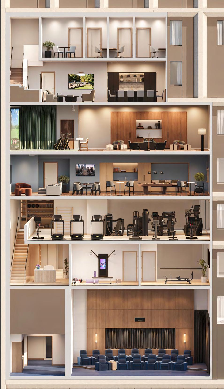 Designed by Morris Adjmi Architects, 18W55 is a balance of classic and contemporary design—rooted in a sensitivity to scale, materiality, and rhythm. With its limestone and bronze exterior palette, the building draws inspiration from the rich architectural tradition of Fifth Avenue. Warm natural woods and brass accents set a welcoming atmosphere throughout the building, while marble, travertine, and stone details evoke timeless elegance. In the residences, open and airy layouts are bathed in natural light with custom finishes that offer an elegant backdrop for daily life. Kitchens are well-appointed with custom lacquered cabinetry and brass pulls, while the bathrooms are bright and airy with refined proportions and tactile textures. Each amenity is crafted as a reflection of its environment—sunlit fitness studios that energize and uplift, sleek and sophisticated lounge spaces, stylish golf havens that invite relaxation, and a co-working suite that inspire focus.
