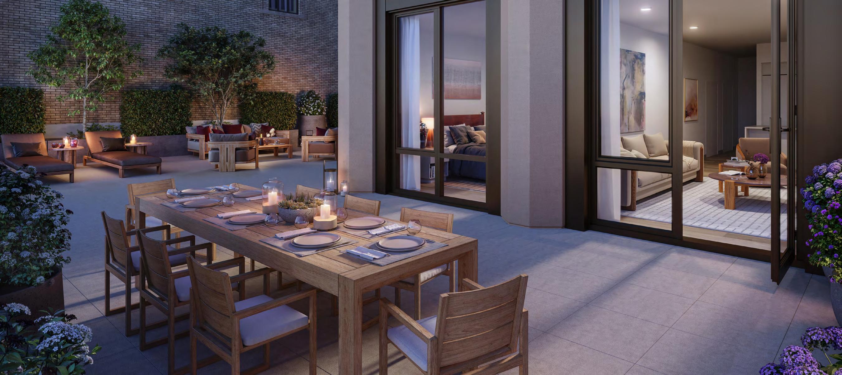 Graciously proportioned and thoughtfully finished, each residence is designed to welcome natural light through oversized windows and ceilings up to nine feet. The interiors strike a refined balance between traditional and contemporary sensibilities, expressed through timeless materials and elegant detailing. Engineered white oak flooring extends throughout the open layouts, while in-home washers and dryers provide a seamless layer of everyday convenience. Many residences are complemented by expansive terraces, seamlessly blending indoor comfort with tranquil outdoor entertaining.