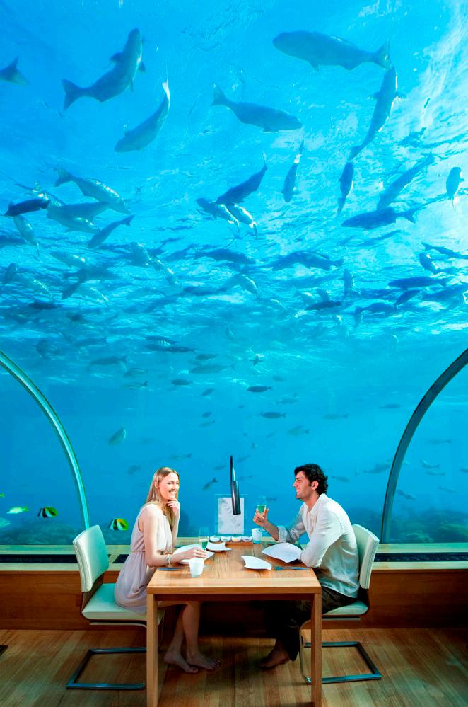Reached by a 30-minute seaplane flight, this spectacular resort offers three resort experiences on two islands and is home to 11 restaurants and bars including: Ithaa Undersea Restaurant, 101 of the world’s best cheeses, the underground Wine Cellar and 20,000 bottles of fine wines. For relaxation, there are two spas, an extensive range of excursions, diving and watersports– including a submarine – a vibrant coral reef and the world’s most perfect beaches