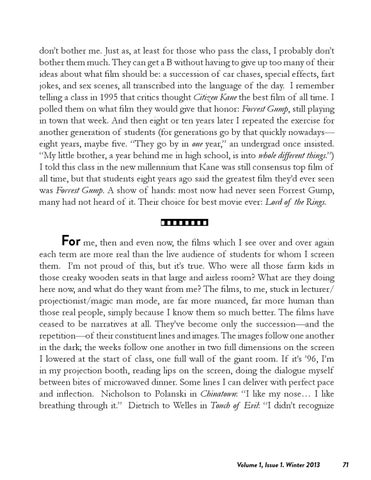 each term are more real than the live audience of students for whom I screen them. I’m not proud of this, but it’s true. Who were all those farm kids in those creaky wooden seats in that large and airless room? What are they doing KHUH QRZ DQG ZKDW GR WKH\ ZDQW IURP PH" 7KH Ă€OPV WR PH VWXFN LQ OHFWXUHU SURMHFWLRQLVW PDJLF PDQ PRGH DUH IDU PRUH QXDQFHG IDU PRUH KXPDQ WKDQ WKRVH UHDO SHRSOH VLPSO\ EHFDXVH , NQRZ WKHP VR PXFK EHWWHU 7KH Ă€OPV KDYH ceased to be narratives at all. They’ve become only the succession—and the repetition—of their constituent lines and images. The images follow one another in the dark;Íž the weeks follow one another in two full dimensions on the screen I lowered at the start of class, one full wall of the giant room. If it’s ’96, I’m in my projection booth, reading lips on the screen, doing the dialogue myself between bites of microwaved dinner. Some lines I can deliver with perfect pace DQG LQĂ HFWLRQ 1LFKROVRQ WR 3RODQVNL LQ Chinatown: “I like my nose‌ I like breathing through it.â€? Dietrich to Welles in Touch of Evil: “I didn’t recognize