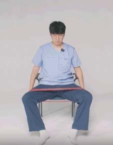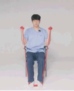 셋째, 팔 앞으로 내밀기는 가슴 근육 운동이다. 밴 드를 등 뒤 날개뼈에 놓고, 어깨 높이에서 팔을 앞 으로 민다. 넷째, 양팔에 체중 싣기는 의자 팔걸이 를 잡고 엉덩이를 들어 올리는 동작으로 삼두근을 강화한다.