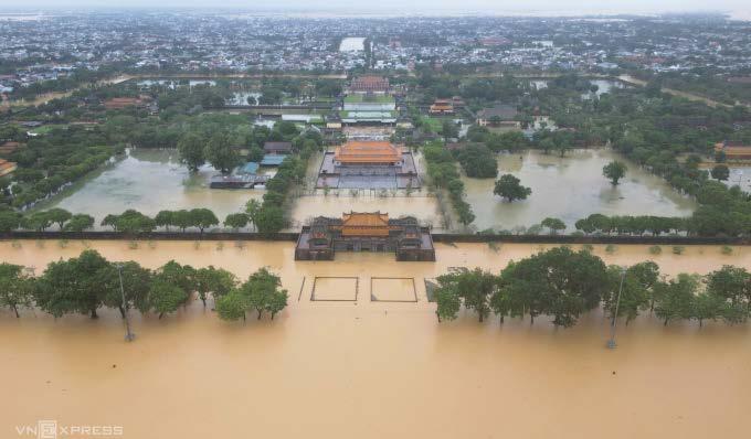 리가 물에 잠겼다. 호이안 에서는 농장으로 가던 남 성 1명이 익사했다. 270 헥타르 이상의 논밭과 양 식장이 피해를 입었으며, 1880m의 도로가 손상되고 3만2800㎥ 이상의 흙과 바 위가 유실됐다. 해안선은 3450m가 침식됐으며, 침 식이 내륙으로 25~30m까 지 진행됐다. 이번 역사적 인 홍수를 직접 겪은 서양 관광객들은 충격적인 경 험을 전했다. 프랑스 관광 객 노아는 "후에 황성(Imperial Citadel) 관광을 마 치고 호텔로 돌아갈 때 물 이 무릎 위까지 올라와 일 행 중 많은 사람이 불어나 는 홍수에 갇힐까 두려워 했다"며 "가벼운 침수로 여 행을 시작했지만, 상황이 이렇게 빠르게 악화될 줄
