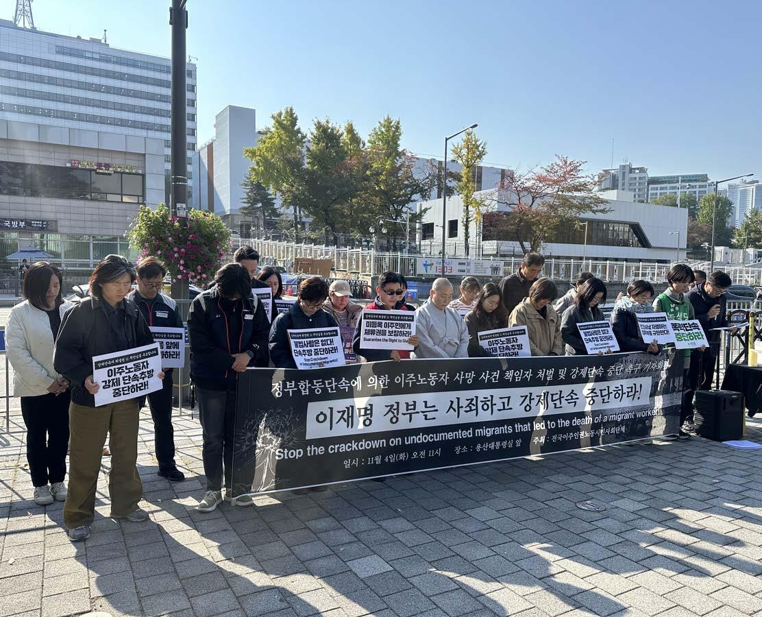 령실 앞에서 기자회견을 열고 베트남 이주 여성 노동자 사망 사건에 대한 책임자 처벌 과 강제단속 중단을 주장했다고 연합뉴스가 보도했다. 우다야 라이 이주노조 위원장은 " 정부는 아시아태평양경제협력체(APEC) 회 의를 성공적으로 개최한다면서 이주노동 자 합동단속을 실시했다"며 "폭력적인 강제 단속 추방 정책을 중단하고 모든 미등록 이 주노동자의 체류권을 보장하라"고 촉구했 다. 지난달 28일 대구 성서공단 내 자동차 부품 제조공장에서는 베트남 출신 여성 노