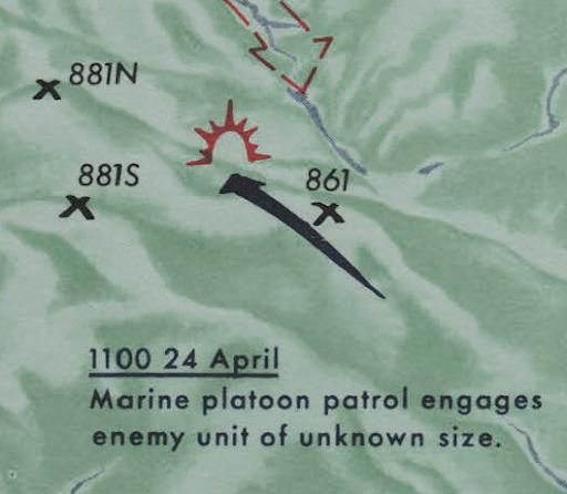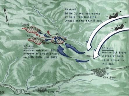 Meanwhile, Company K arrived at Khe Sanh. They immediately began advancing towards Hill861. Despite severe communications problems, they advanced to within 500 meters of the crest of Hill 861. They ran into
