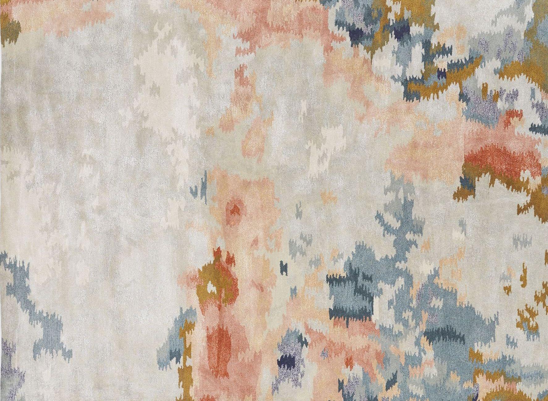 A colorful abstract rug provides the inspiration for pattern and colors int the throw pillows and ties into the color palette of the rest of the home.