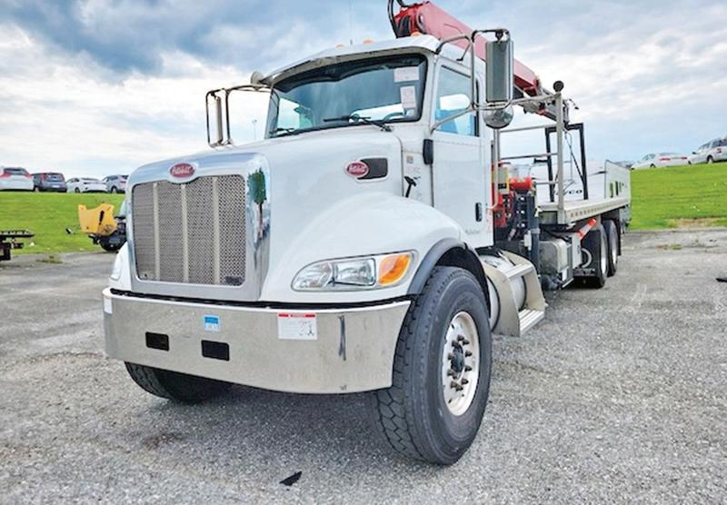 2022 PETERBILT 348 ALUM. FLATBED W/FASSI KNUCKLE BOOM CRANE. L9 Cummins 350 HP, 6 Spd, 66K GVW, 57K Miles, stk#340203, $189,900.