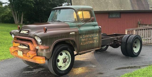 1956 GMC CAB & CHASSIS. Inline 6 Cyl. Gas, 4 Spd Trans, 2 Spd Axle, Bench Seat, Barn Stored All Its Life, Rust-Free, Runs & Drives Excellent, $19,500. Trades Accepted