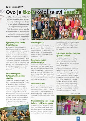 Imresivan Marjan i bogata splitska tržnica U petak smo se popeli na vrh Marjana. Vidjeli smo hrvatsku zastavu i otpjevali pjesmu Marjane, Marjane. S vrha brda lijepo se vidio cijeli Split, otoci Brač i Šolta i planine Kozjak i Mosor. Posjetili smo i tržnicu ribom. Vidjeli smo lignje, sipe, hobotnice, jastoge i ribe o kojima smo učili na satovima prirode. Nakon ručka otišli smo se na plažu pozdraviti s morem. Kupali smo se i gradili u pijesku brdo Marjan, kopali špilju Vranjaču i rijeku Jadro. Poslije večere slijedila je dodjela priznanja za najuredniju sobu. Bila sam sretna što je to bila baš naša soba: Mini Hops. Ujutro u subotu krenuli smo kući. U Splitu mi je bilo jako lijepo, ali sam jedva čekala da vidim svoje roditelje i ispričam im o svemu lijepom što sam doživjela. Ivana Kovačić, 4.b