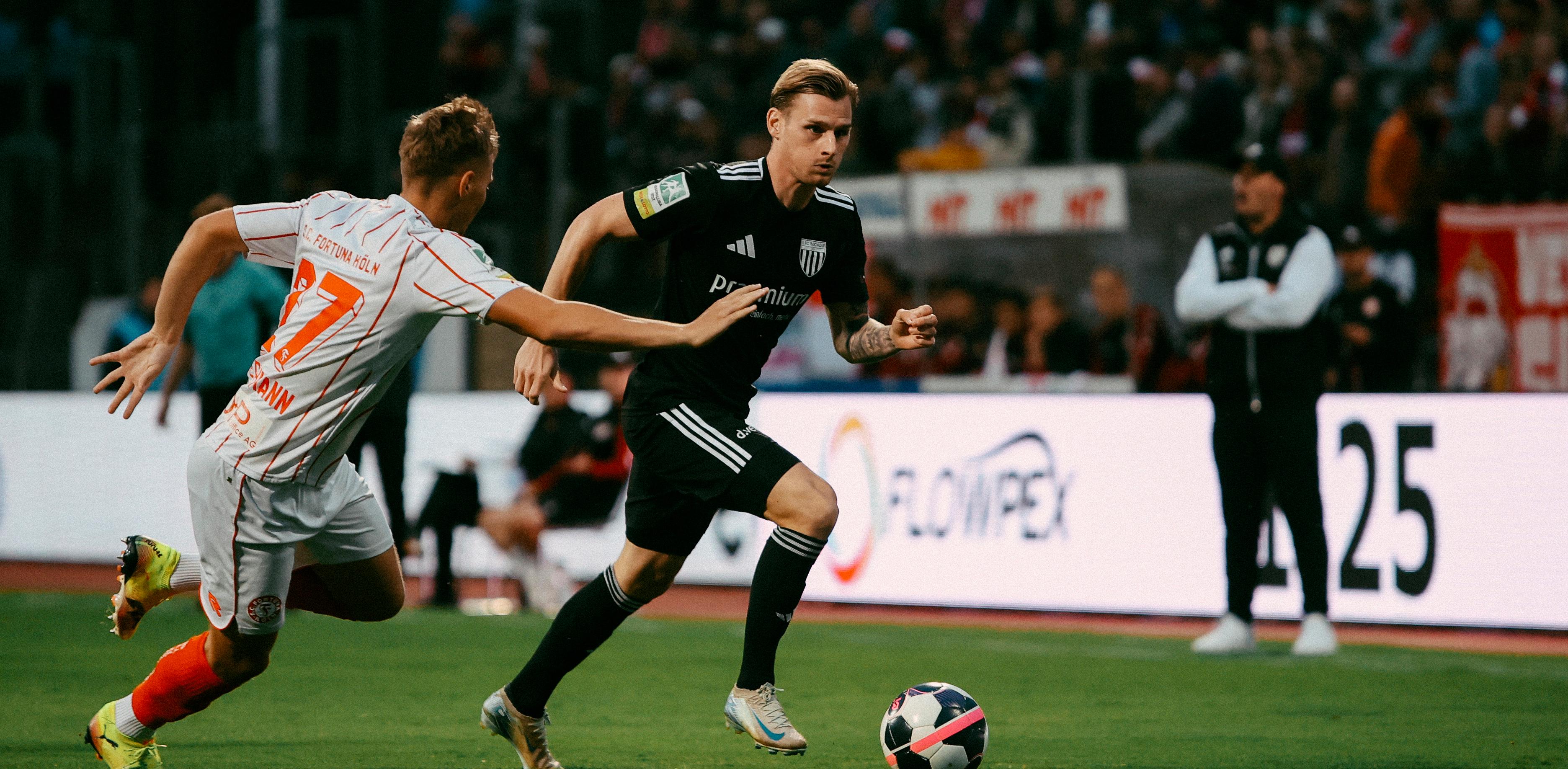 schluss von Johannes Dörfler in die zweite Etage (3.) sollte auch gleich der erste gelungene Angriff sitzen. Als sich Kölns Tom Geerkens einen Fehler im Spielaufbau erlaubte, schaltete Maximilian Adamski schnell und leitete das Leder weiter. Arnold Budimbu ließ Holldacks Ball clever durch sodass Jonas Carls aus dem Rückraum anrauschen und das 1:0 erzielen konnte, Carls‘ erstes Saisontor war noch leicht abgefälscht (13.). Bezeichnend für die Bocholter Stärke im ersten Durchgang war, dass Köln erst ab Minute 25 besser in die Partie kam und erste Torabschlüsse verzeichnen konnte. Enzo Wirtz‘ Kopfball-Aufsetzer (26.) und Hamadi Al-Ghaddiouis Drehschuss (29.) sollten Fox aber vor keine Probleme stellen. Allgemein war die Fortuna nun präsenter in der Bocholter Hälfte, konnte sich aber keine zwingenden Chancen erspielen, denn die FCB-Defensive leistete hervorragende Arbeit in der ersten Halbzeit. Nachdem Holldack an der Strafraumkante noch einmal Maß nahm, aber zu hoch zielte, (37.) und Wirtz keinen Druck hinter seinem Kopfball bekam (45.) bat Schiedsrichter Nils Hasse zur Halbzeitpause.