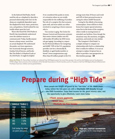 average more than 20 hours each week and 20% of their personal income in caring for others (AARP Research). Caring for the elderly is becoming commonplace. Some still live in their homes but require special attention; some live in the home of the caregiver; others reside in nursing homes or extended care facilities. Even though the situations vary, the emotions, struggles, questions, and needs are very similar. “The Caregiver’s 23rd Psalm” is a simple attempt to compare our relationship with God to a relationship that is reality for millions. It is not an attempt to replace Scripture but an effort to provide a new perspective on this timeless passage.