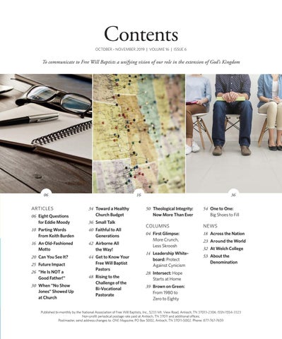 Published bi-monthly by the National Association of Free Will Baptists, Inc., 5233 Mt. View Road, Antioch, TN 37013-2306. ISSN 1554-3323 Non-profit periodical postage rate paid at Antioch, TN 37011 and additional offices. Postmaster, send address changes to: ONE Magazine, PO Box 5002, Antioch, TN 37011-5002. Phone: 877-767-7659